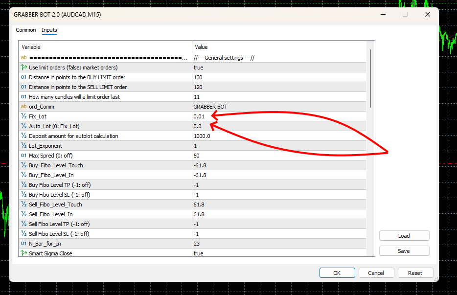To switch GRABBER BOT to fixed lot size trading mode, set the Auto-lot variable to “0” and set the Fix Lot variable to the desired value: