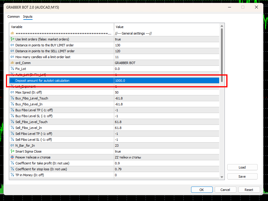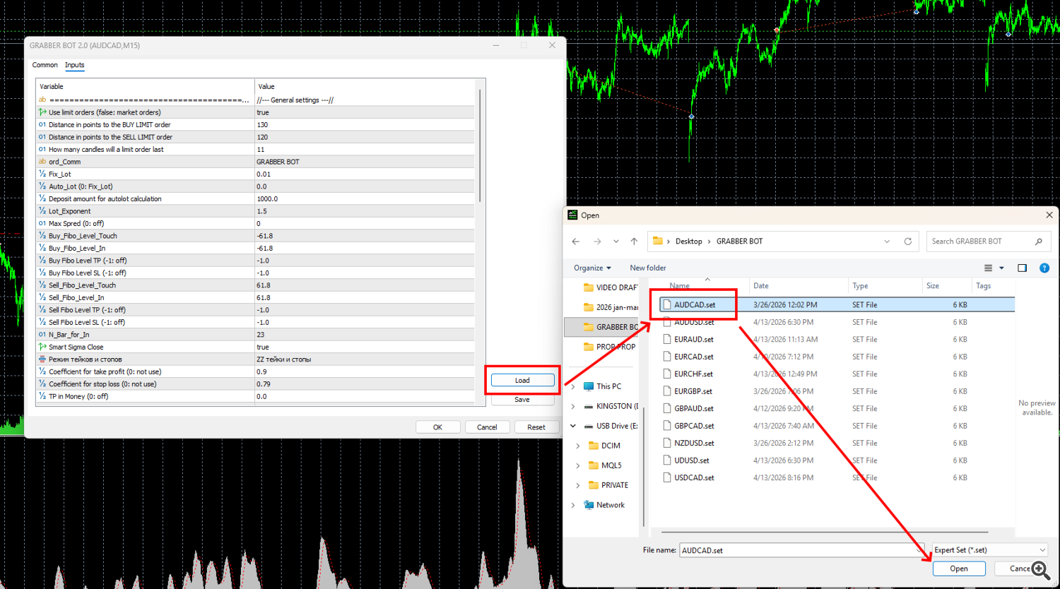 After you drag GRABBER BOT onto the quote chart, its manual settings window will open automatically. You need to click on the “LOAD” button to load the set file for automatic configuration of the trading bot. Using your PC’s internal navigation, find the folder with the set files that you downloaded from the link above and select the appropriate set file. Of course, the name of the set file must match the name of the currency pair on which you are configuring the GRABBER BOT. That is, if you are configuring the advisor on the AUDCAD currency pair, you need to load the set file named AUDCAD: