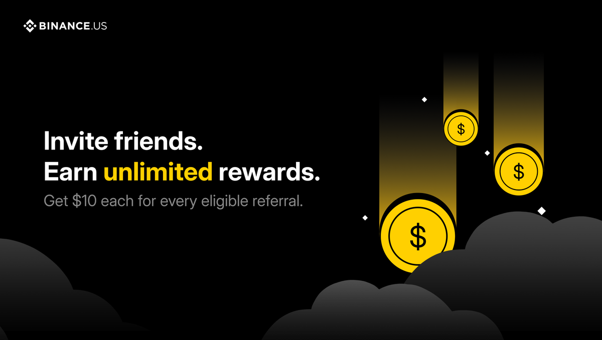 Crypto is better with friends. We’re excited to re-introduce the Binance.US Referral Program, with top rewards and unlimited payouts. Get paid for every successful referral, with no limits to how much you can earn. You and your friend both get $10 each when they successfully complete account verification using your referral and they purchase or trade at least $100 of crypto within their first 30 days of completing account verification.